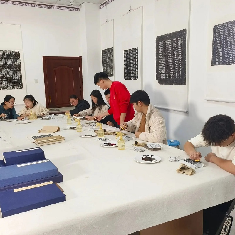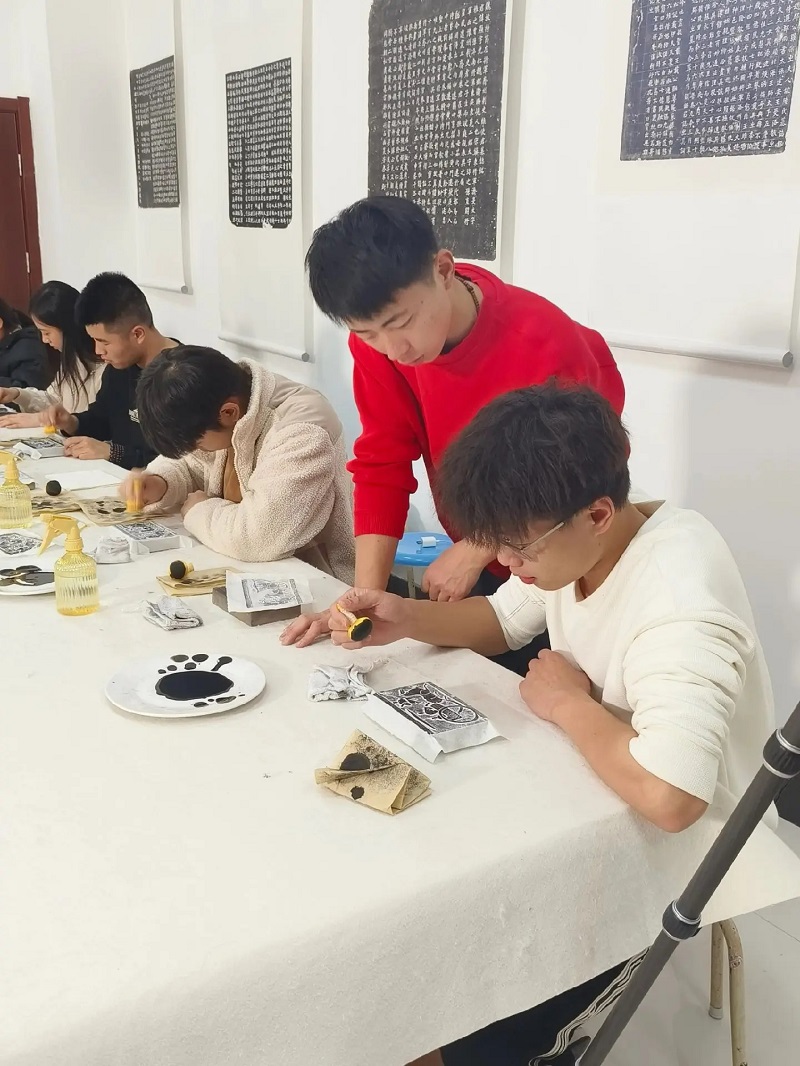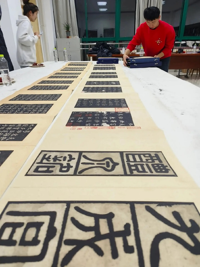 经过理论知识的浸润之后,同学们迫不及待地开始了传拓的实践。同学们积极尝试,巩老师悉心指导,氛围很是融洽。随着拓包在宣纸上一遍遍行走,一个个精美图案跃然纸上。