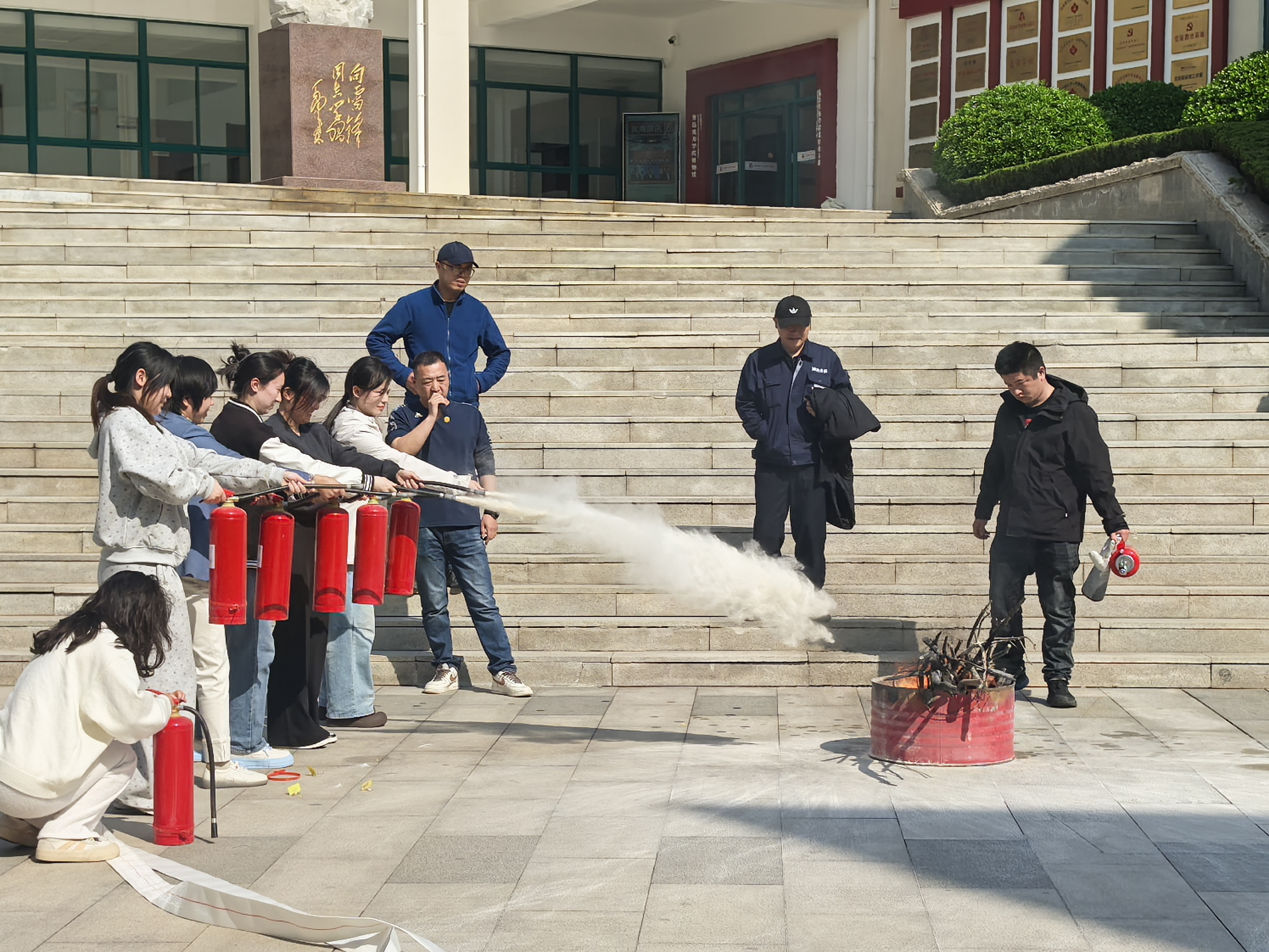 3.器材使用:详细介绍干粉灭火器、二氧化碳灭火器、消防水带等设备的适用场景,通过实物操作演示“一提、二拔、三瞄、四压”的灭火器使用口诀。