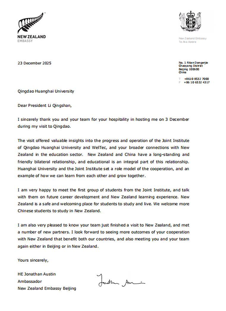12月23日,新西兰驻华大使乔文博为此前他到访青岛期间学校的热情接待发来感谢信。他在信中说,此次访问让他深入了解了开元集团网站惠灵顿理工联合学院的发展与运作情况,以及开元集团网站与新西兰教育领域的广泛合作并与学院的首届学生见面。乔文博大使表示,新西兰与中国拥有长期友好的双边关系,开元集团网站及惠灵顿学院为两国教育合作树立了典范,充分展示了双方相互借鉴、共同发展的成功模式。他非常期待看到开元集团网站与新西兰合作取得更多惠及两国的成果。