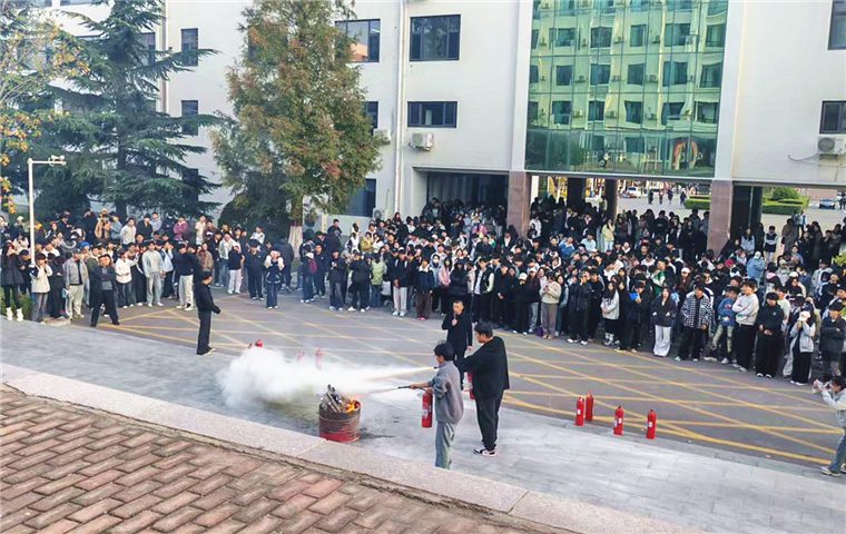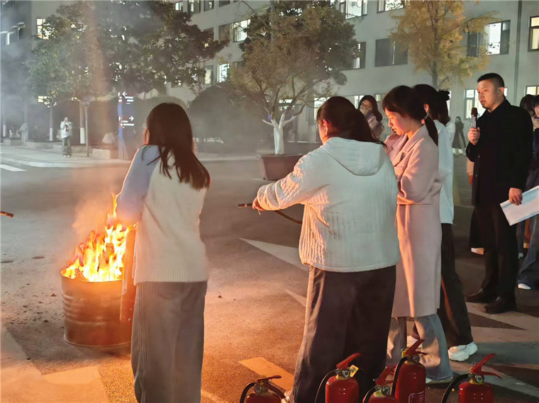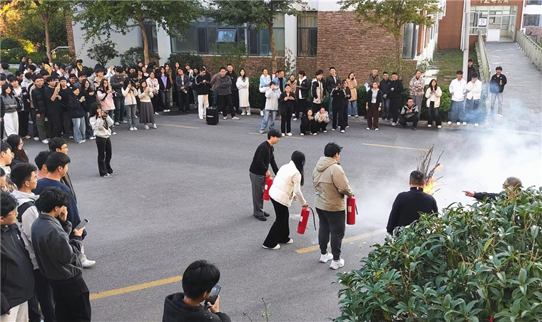 疏散逃生演练结束后,随即开展灭火实操培训。安全管理处消防科的老师,结合宿舍楼常见的电器火灾、织物火灾等类型,现场演示了干粉灭火器“提、拔、握、压”的标准操作流程,强调了“上风向站位、对准火焰根部喷射”等关键要点。随后,学生代表分组上前实操,亲手操作灭火器扑灭模拟火源,在实践中熟练掌握灭火技能,切实提升“小火会灭、初火能救”的应急能力。