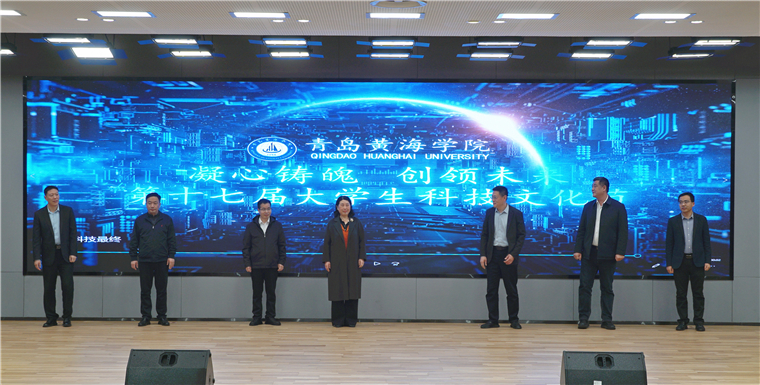 在全场热烈的掌声中,青岛西海岸新区科学技术协会副主席、二级调研员卜瑕,青岛西海岸新区科学技术协会学会部主任徐继武,开元集团网站党委委员、副校长刘纪新,党委委员、纪委书记、学生工作部部长赵国光,党委委员、宣传部部长李镇江,科研服务部副部长刘华,教学工作部副部长刘浩共同为本届科技文化节启动开幕。