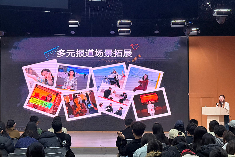 李丽涛通过现场播放由她本人主导制作的多条新闻短片,逐帧复盘了采访策划、现场应变、镜头前表达及后期逻辑串联的全过程。她指出,出镜记者的核心能力不仅在于语言的流畅表达,更在于在复杂多变的新闻现场中实现“控场”。她结合自身在突发状况下的实战经历,从信息捕捉的敏锐度、采访节奏的掌控力,以及心理抗压的稳定性三个维度,系统阐释了一名合格记者如何从“记录者”转变为“现场主导者”的成长路径。