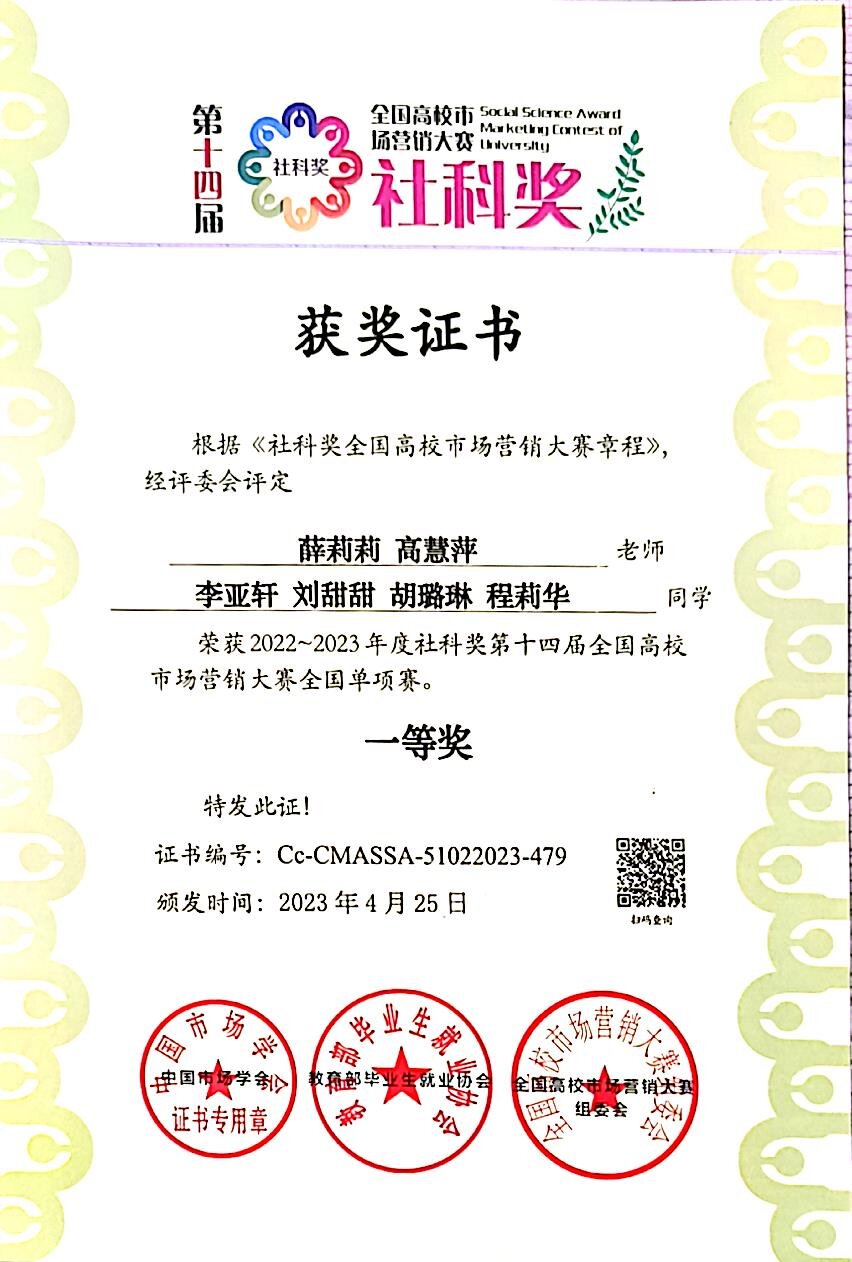 获得全国高校商业精英挑战赛品牌策划竞赛、国际贸易竞赛、会展策划竞赛等获国家级奖项9项、省级奖项20余项;指导社科奖全国高校市场营销大赛获国家级奖项20余项,获“营销实践教学示范奖”。指导学生参与大创项目的调研、论证、写作和修改工作,获批省级立项大创项目1项,校级大创项目6项,孵化创业团队6个。