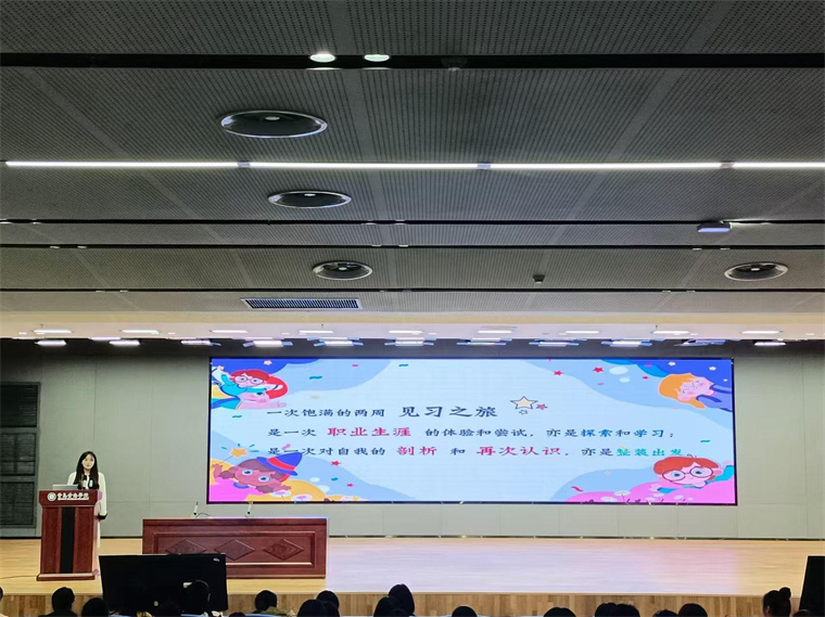 大会伊始,主持人宣布了本次大会的目的与开展方式,接下来各班代表纷纷上台分享了教育见习过程中的真实经历与感受。各位同学讲述的内容维度清晰,富有条理,能够结合见习园所的办园理念、保育教育工作、教育活动观摩与组织等,选取典型事例进行总结与思考,并分享了一些在幼儿园的所见所闻、收获以及挑战。在此基础上,同学们表明通过教育见习更深刻地认识到了幼儿园教师的职业特点与工作性质,发展了自身的组织协调能力、适应能力和工作能力,也意识到自身在将理论知识转化为教育实践能力中的不足,未来还要继续加强专业学习,保持专业敏感度,以适应职业发展的需要。代表们的发言引发了全场的共鸣和掌声。