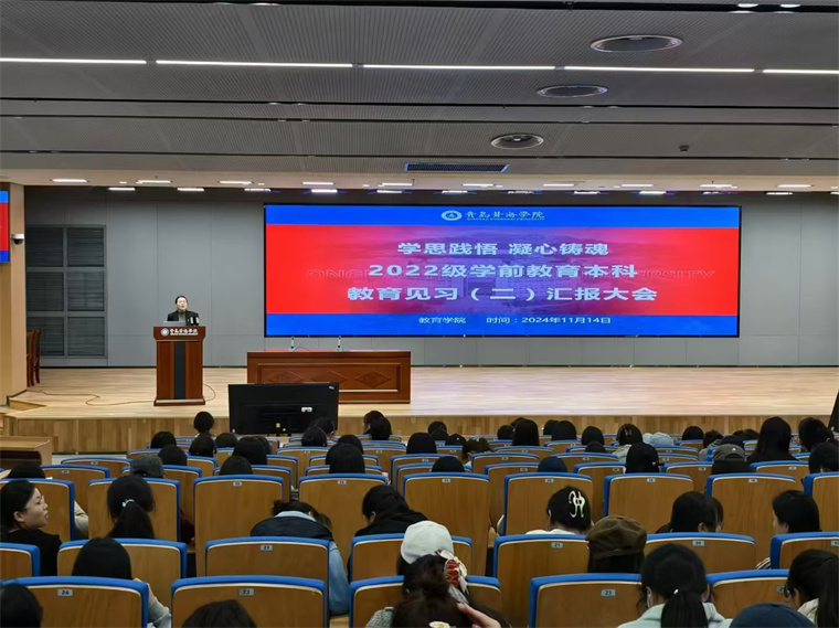 为全面展示教育见习成果,强化同学们对教育实践过程的反思与总结,2024年11月14日下午16:00,教育学院于知信楼B01报告厅召开“2022级学前教育本科教育见习分享大会”,出席本次会议的有教育学院院长助理刘艺敏、教育学院教学秘书杨英超、学前教育教研室(一)主任毛玉蕊、学前教育教研室(二)主任罗雅会以及顾娟老师、隋洁老师、李昕老师等见习指导教师,全体2022级学前教育本科生参会。