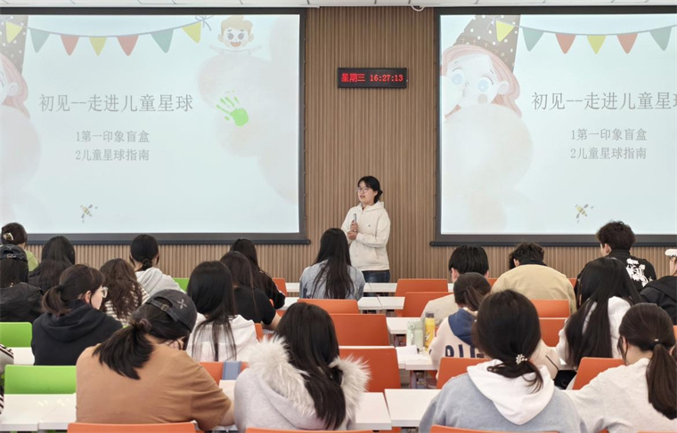 接下来,由学生依次汇报。第一位同学范文媛,汇报主题——“与童心对话的9天”。她从起初进入园内的感受与情形为切入点,将这段时间自身情绪与状态的蜕变娓娓道来。这段经历不仅重塑了她的教育观与儿童观,更让她深刻领悟到教师职业“润物无声”的深刻内涵。