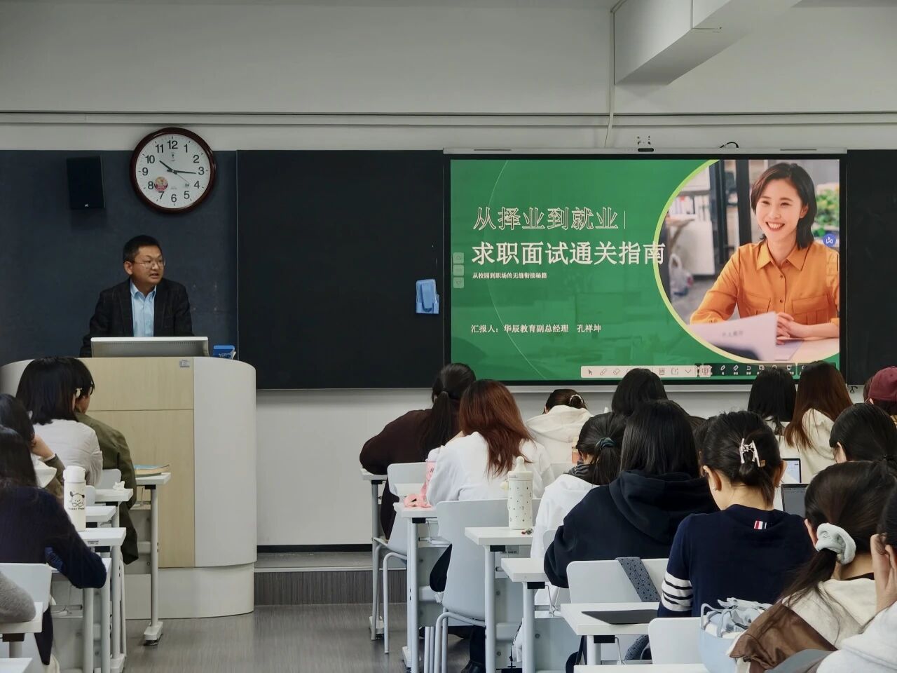 课堂上,孔老师结合多年行业经验与商英专业就业现状,点明提前制定职业生涯规划的重要性,梳理专业发展优先级,并深度拆解各类就业方向。既重点分析外贸、口译等对口优势领域,结合行业趋势讲解市场需求,也全面对比考公考编、教育行业、民航、外企等方向的优劣势,给出实用的就业选择与避坑建议。