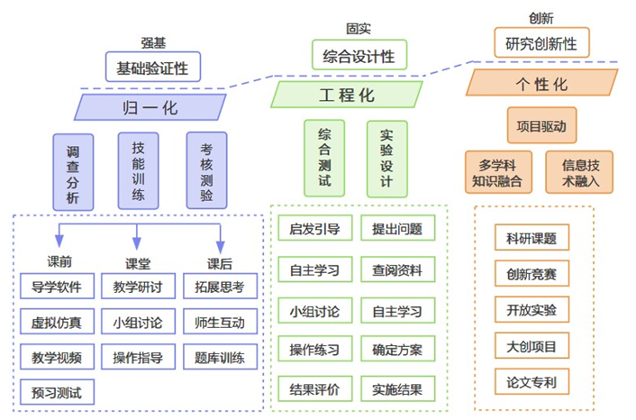 聚焦学生核心能力与素质的培养,采用归一化、工程化、个性化教育的多元化教学模式,从“强基”“固实”“创新”3个层面循序渐进提升学生的工程实践能力和创新能力。