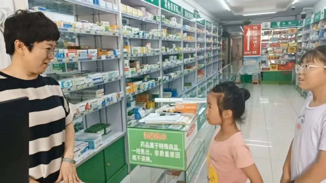 讲解结束后,8名志愿者带领16名孩子走进社区,一组孩子在街角遇到清扫街道的环卫工师傅,起初紧紧拉着志愿者衣角不敢上前,志愿者先主动向师傅问好并说明来意,在志愿者的眼神鼓励下,孩子小阳鼓起勇气问 “爷爷,您每天几点开始扫地呀”,师傅笑着回答“凌晨五点就来了,要把街道扫干净让大家走路舒服”,孩子认真把 “凌晨五点”“清扫街道”记在心中;另一组孩子走进社区药店,面对整理货架的药师阿姨,孩子小雨从小声提问“阿姨,您怎么知道哪种药能治病呀”,到慢慢放开声音倾听阿姨“要学很多医药知识才行”的讲解,还留意到墙上“药品非质量原因概不退换”的提示并记录下来,一上午的寻访中,孩子们从躲在志愿者身后、声音微弱,逐渐变得能主动开口、认真记录,每一步都透着成长的痕迹。