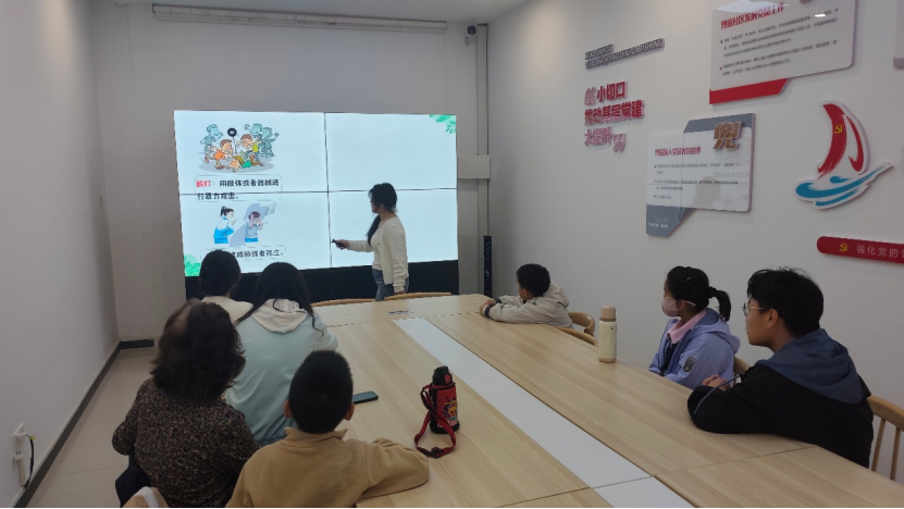活动伊始,在社区会议室的大屏前,一场趣味十足的安全科普活动正温馨开讲:志愿者们利用原创卡通绘本、视频、动画片段,把“防诱骗”“身体隐私保护”“交通安全”等知识拆成生动场景——屏幕上,拳头挥舞的“殴打”、恶语相向的“欺凌”都配上了形象的小人插画,让小朋友一眼就能看懂危险信号,直观讲解了防诱骗、身体隐私、交通安全等核心规则。