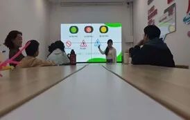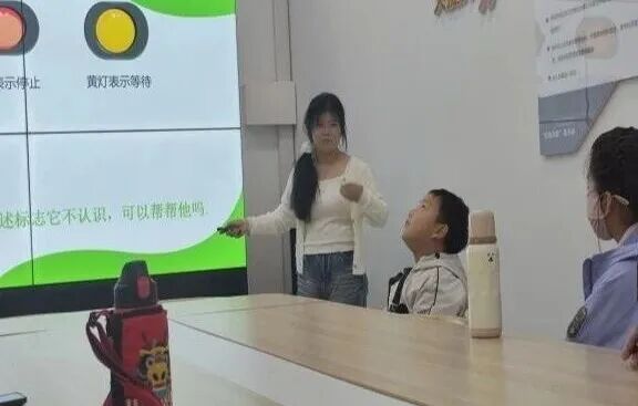 在课堂上,志愿者正带着孩子们玩“身体红绿灯”互动游戏:大屏上醒目的红、黄标识对应着“停止”“等待”的身体界限规则,她指着画面里的卡通提示,引导孩子们识别“哪些接触是需要拒绝的”。桌旁的小男孩仰着头专注地听着,志愿者讲到“遇到陌生触碰要像红灯一样立刻说‘不’”时,孩子们跟着模仿起“大声拒绝”的动作,把“守护身体界限”的意识融进了生动的游戏里。