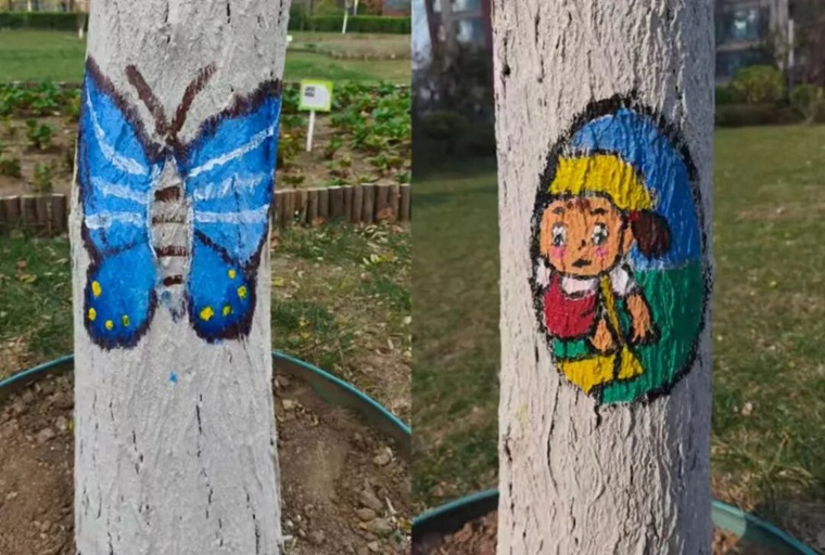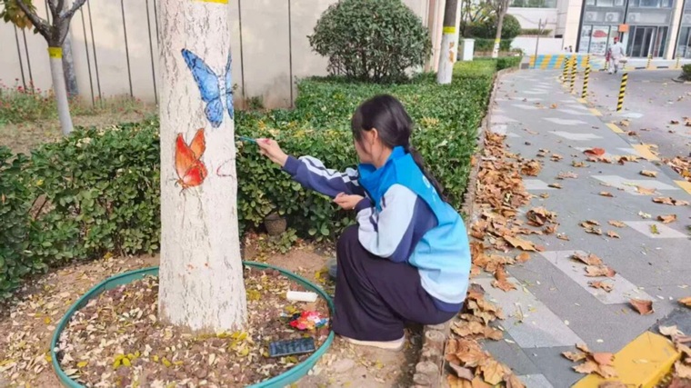 志愿者们分工协作、各展所长,让树木装扮的创意实践落地生花。大家先细心清理树干表面的浮尘与杂物,为创作筑牢洁净基底;随后有人手持画笔,以秋为灵感调色,将银杏的金黄、枫叶的嫣红、芦苇的苍劲凝于笔尖,在树身勾勒出秋叶翩跹、秋果盈枝的诗意图景,或是点缀南瓜、麦穗等充满秋趣的卡通形象;有人则搭配麻绳、干花、松果等天然材料,为树干缠绕出错落有致的装饰绳结,在枝桠间悬挂起风干的枫叶、手工编织的秋叶挂饰,让自然肌理与手工巧思相映成趣;还有志愿者负责统筹协调,根据树木形态规划创作主题,及时补充颜料、工具,确保每一棵树木都能在集体智慧下,蜕变为承载秋韵与温情的社区景致。