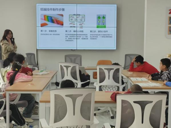 最后,志愿者与孩子们一起制作清明主题纸编挂件。大家先将彩纸剪成14条等长纸条,随后在志愿者的指导下交错编织成小网格,最后用彩笔和贴纸装饰上青团、柳枝等清明元素。孩子们捧着自己的作品,在动手实践中感受传统节日的乐趣。