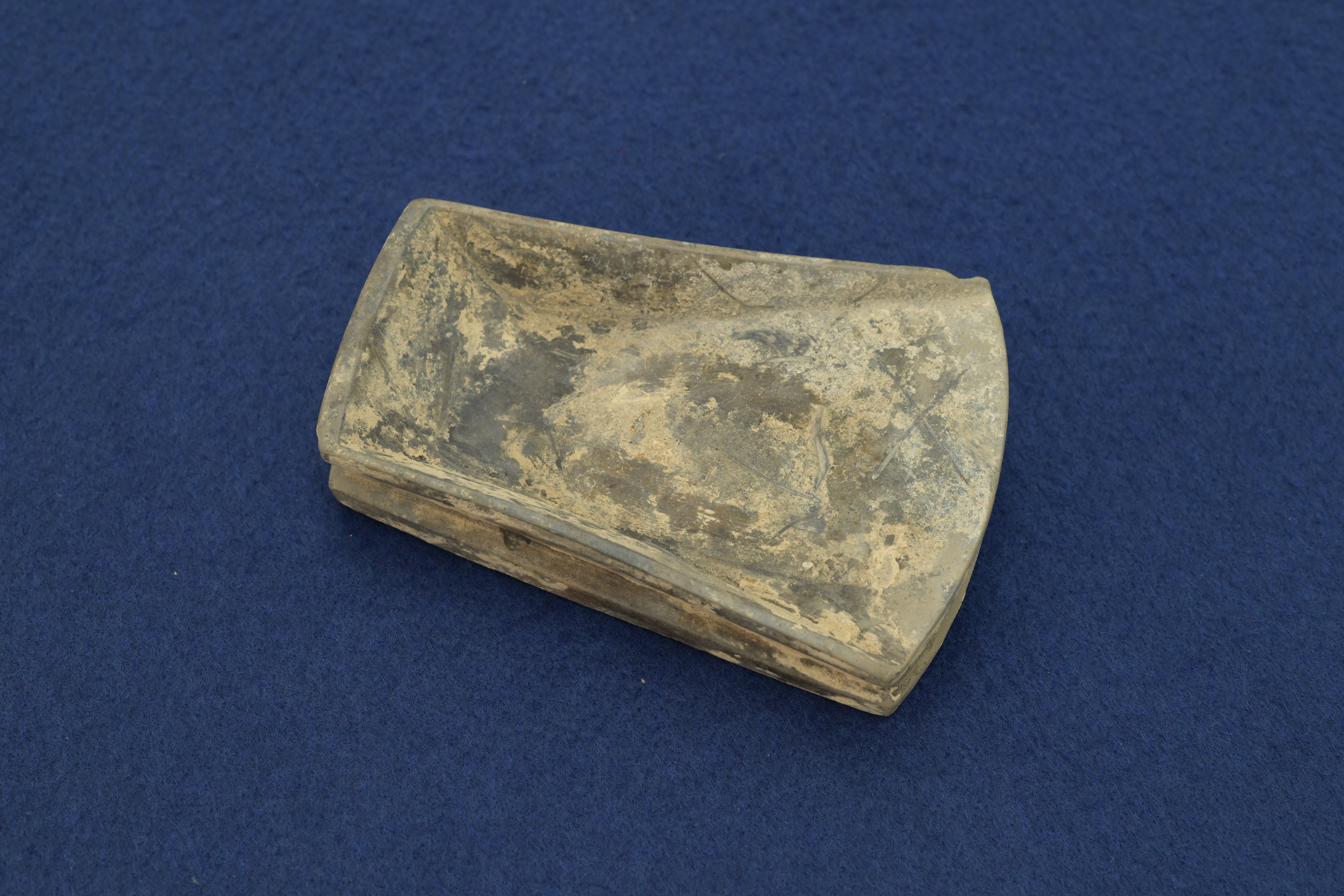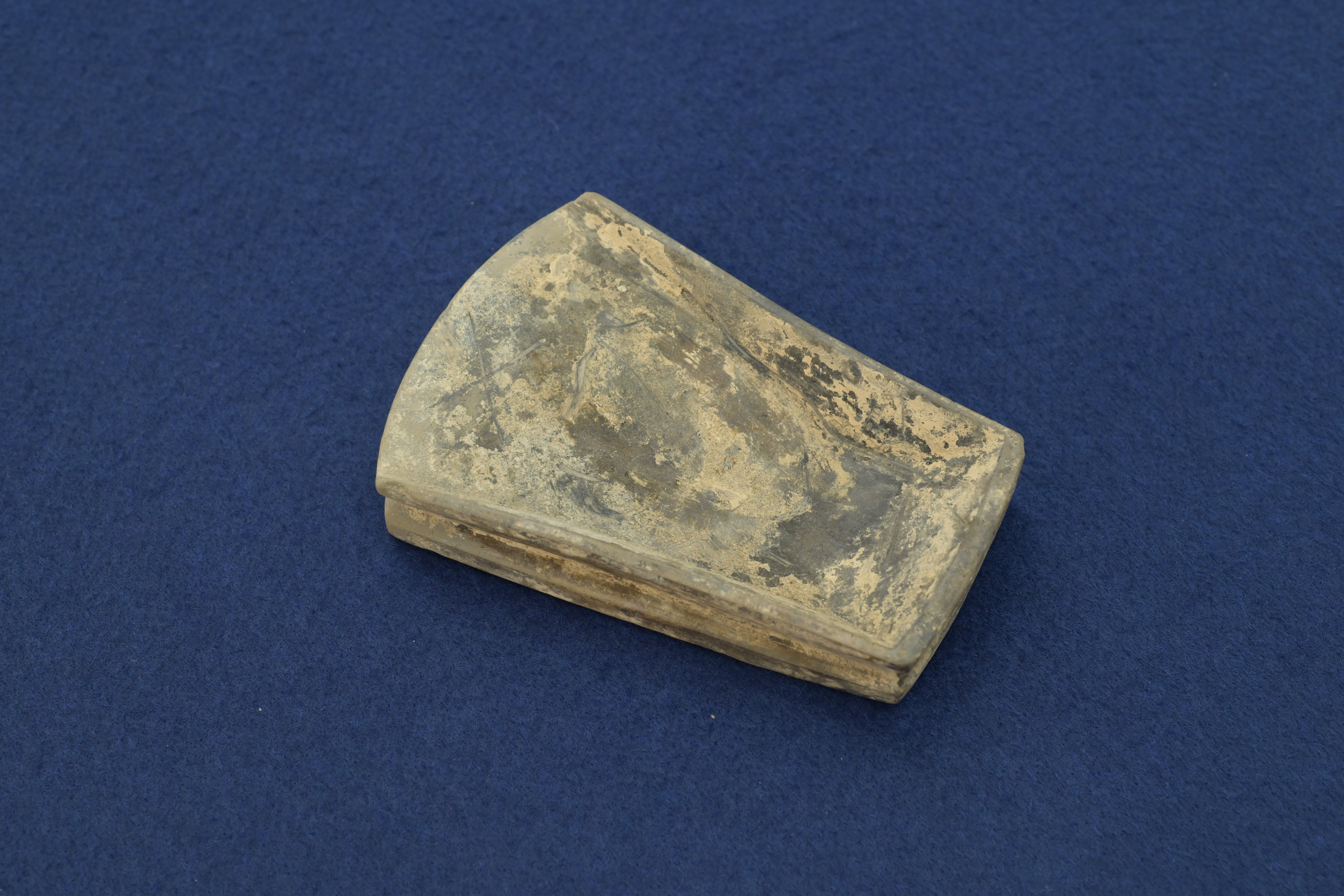 这方砚台采用了唐代最流行的箕形砚形制,整体造型酷似一只簸箕。砚面呈前低后高的斜坡状,这种设计让研磨出的墨汁能自然汇聚于砚首,方便文人蘸笔书写。砚尾微微翘起,既防止墨汁外溢,又便于手持。底部的双足设计,不仅让砚台稳稳立于案头,也适应了唐代低矮案几的使用场景。