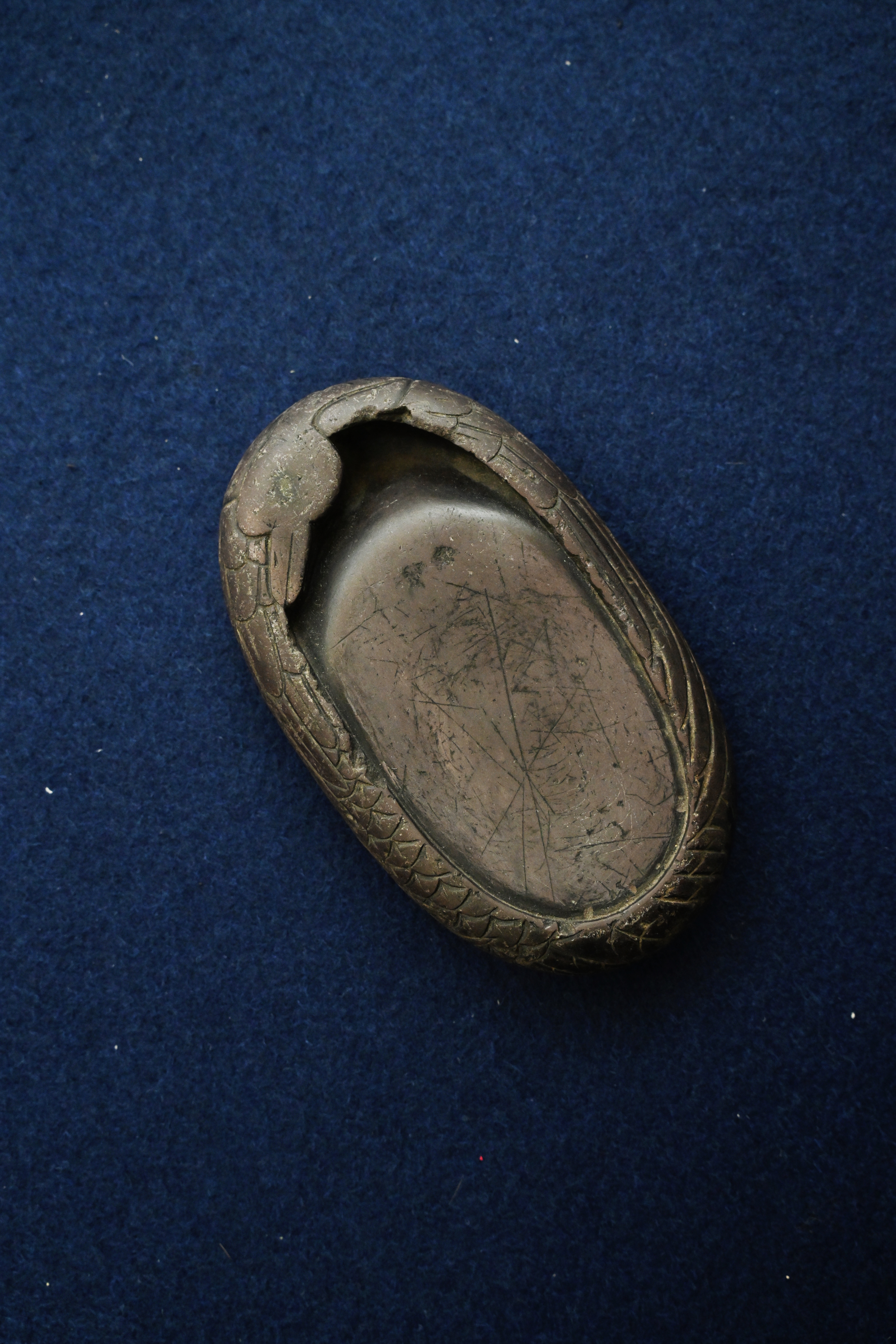 作为明代文房常用之器,这方鹅形砚的功能设计贴合文人日常书写需求。砚堂开阔平整,利于研磨墨汁,发墨效率高;砚池与砚堂衔接自然,倒水研墨时水量可控,避免墨汁溢洒。同时,其鹅形造型并非单纯装饰,而是明代匠人 “因材施艺” 理念的体现,既保留了端砚的实用属性,又通过仿生设计赋予砚台灵动的艺术美感,是实用与审美完美融合的文房珍品。
