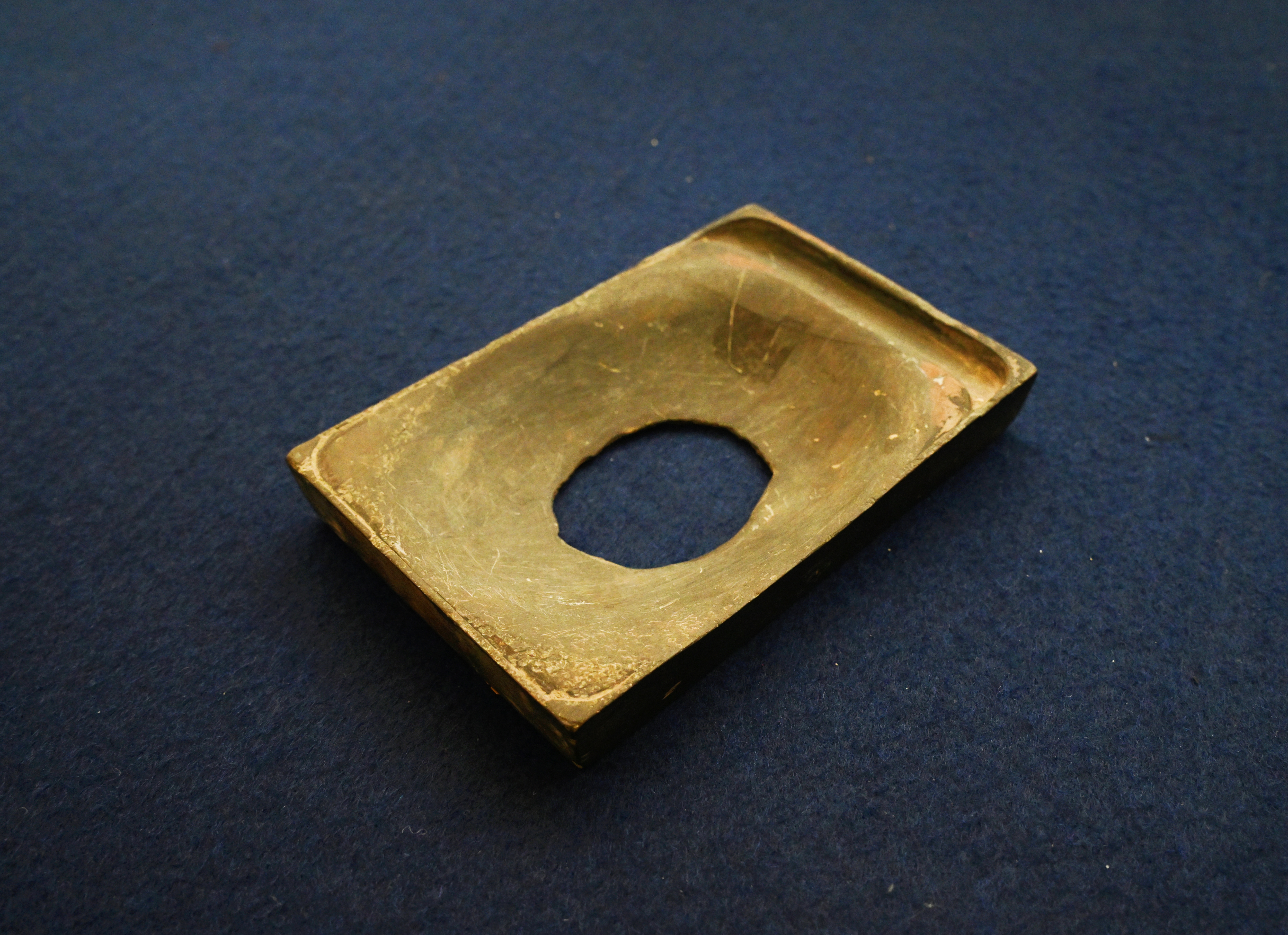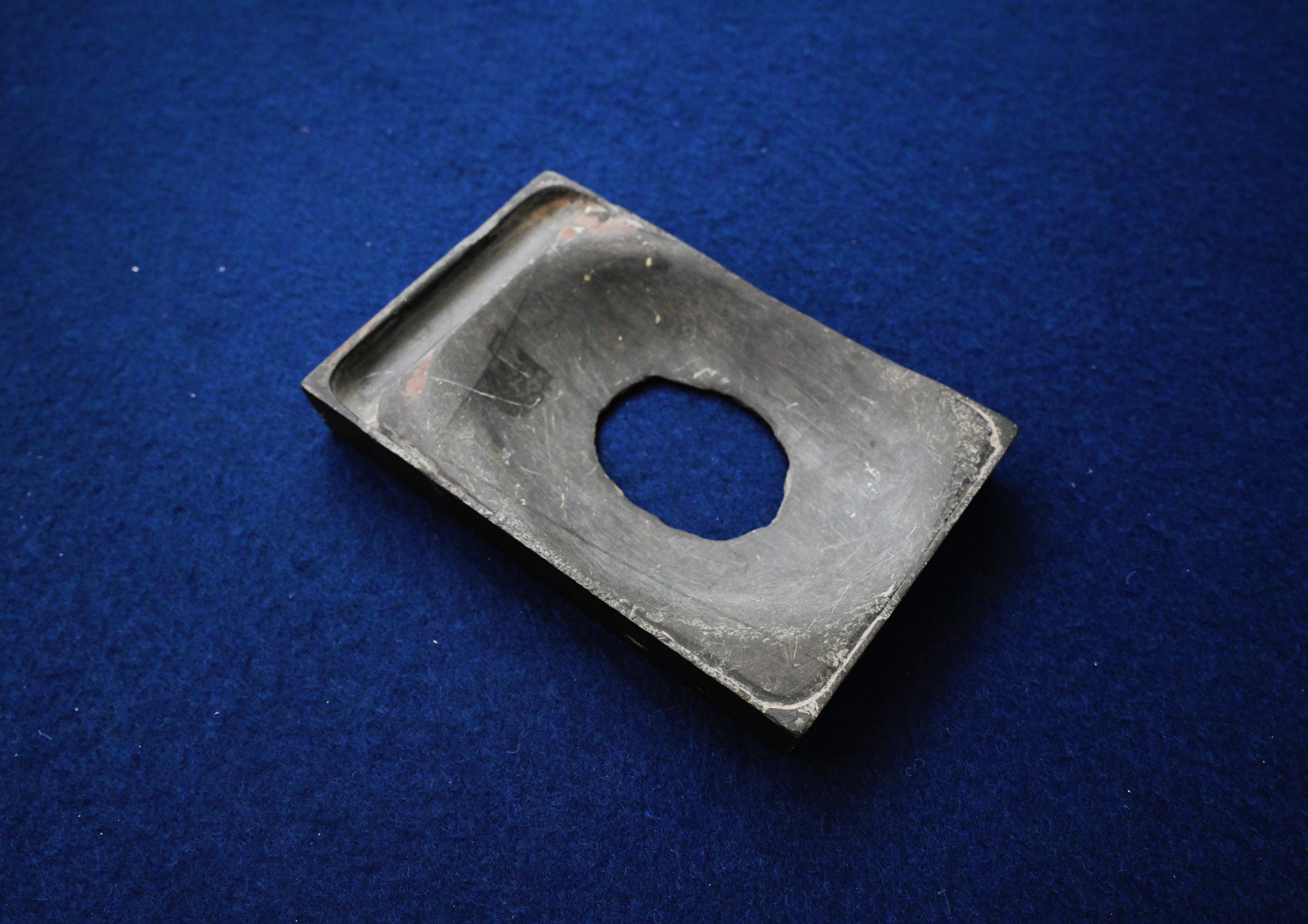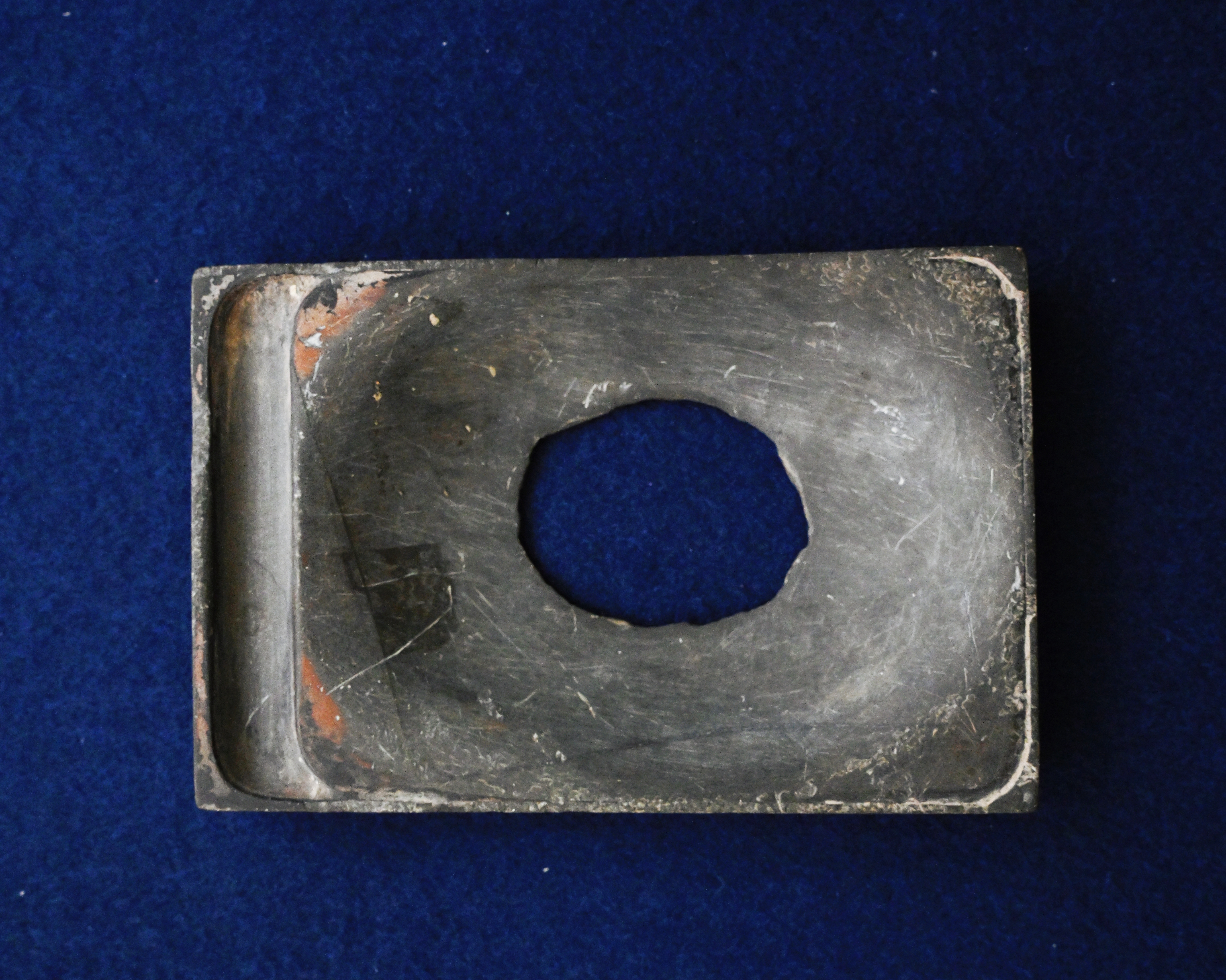 这是一方典型的宋代长方形石砚,质地坚实细腻,整体呈古朴的深灰色。砚面左侧保留着规整的砚池,便于储墨研墨;而砚堂中央,却有一个不规则的圆形破洞 —— 这并非先天残缺,而是经年累月反复研磨、笔锋与砚石激烈碰撞的结果。砚台边缘虽有磨损,却仍能看出当年规整的打磨工艺,尽显宋代文房用具的实用主义审美。