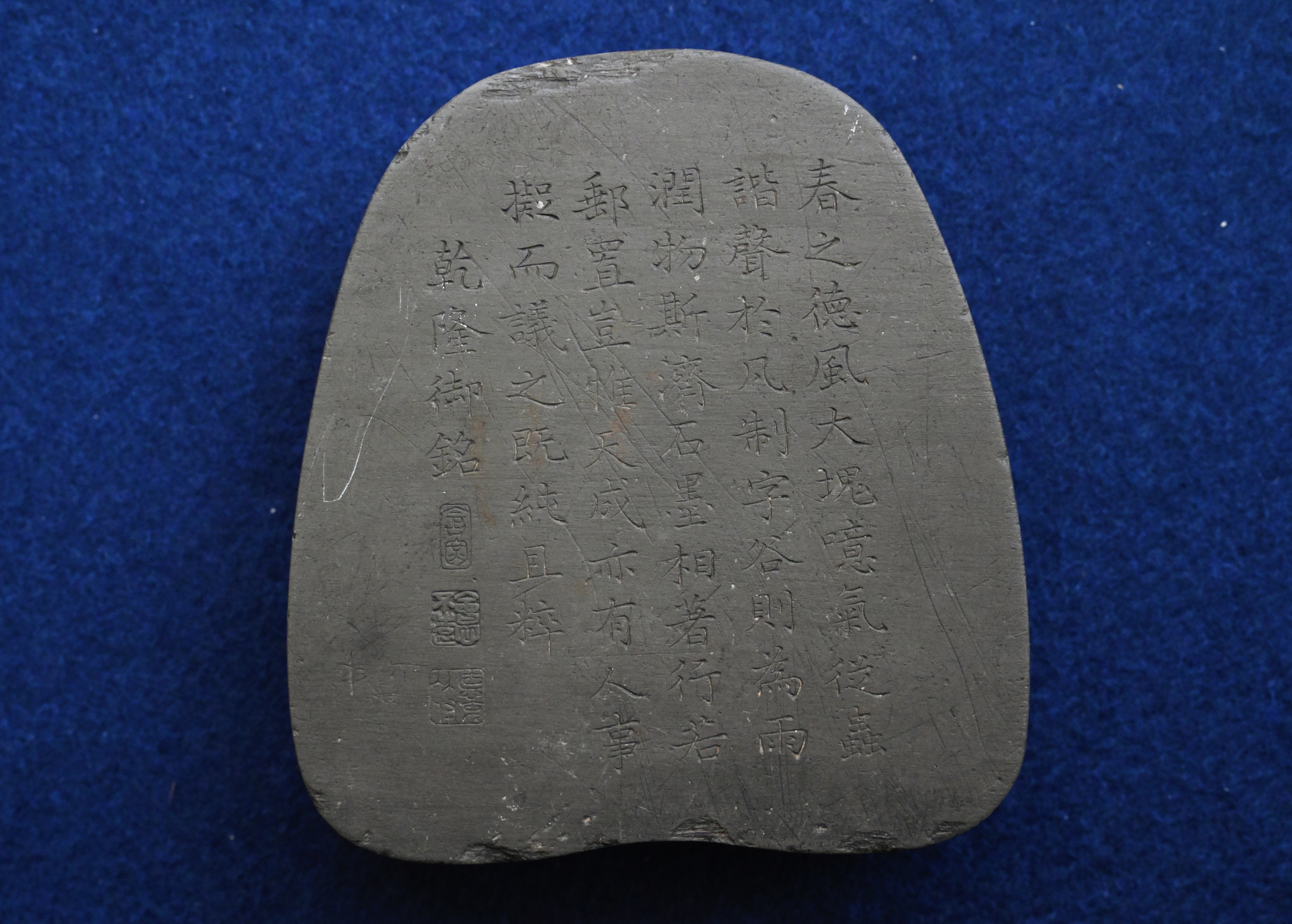 砚台背面镌刻着乾隆乙未年御铭:“春之德风,大块噫气。从虫谐声,于凡制字。谷则为雨,润物斯济。石墨相著,行若邮置。岂惟天成,亦有人事。拟而议之,既纯且粹。”