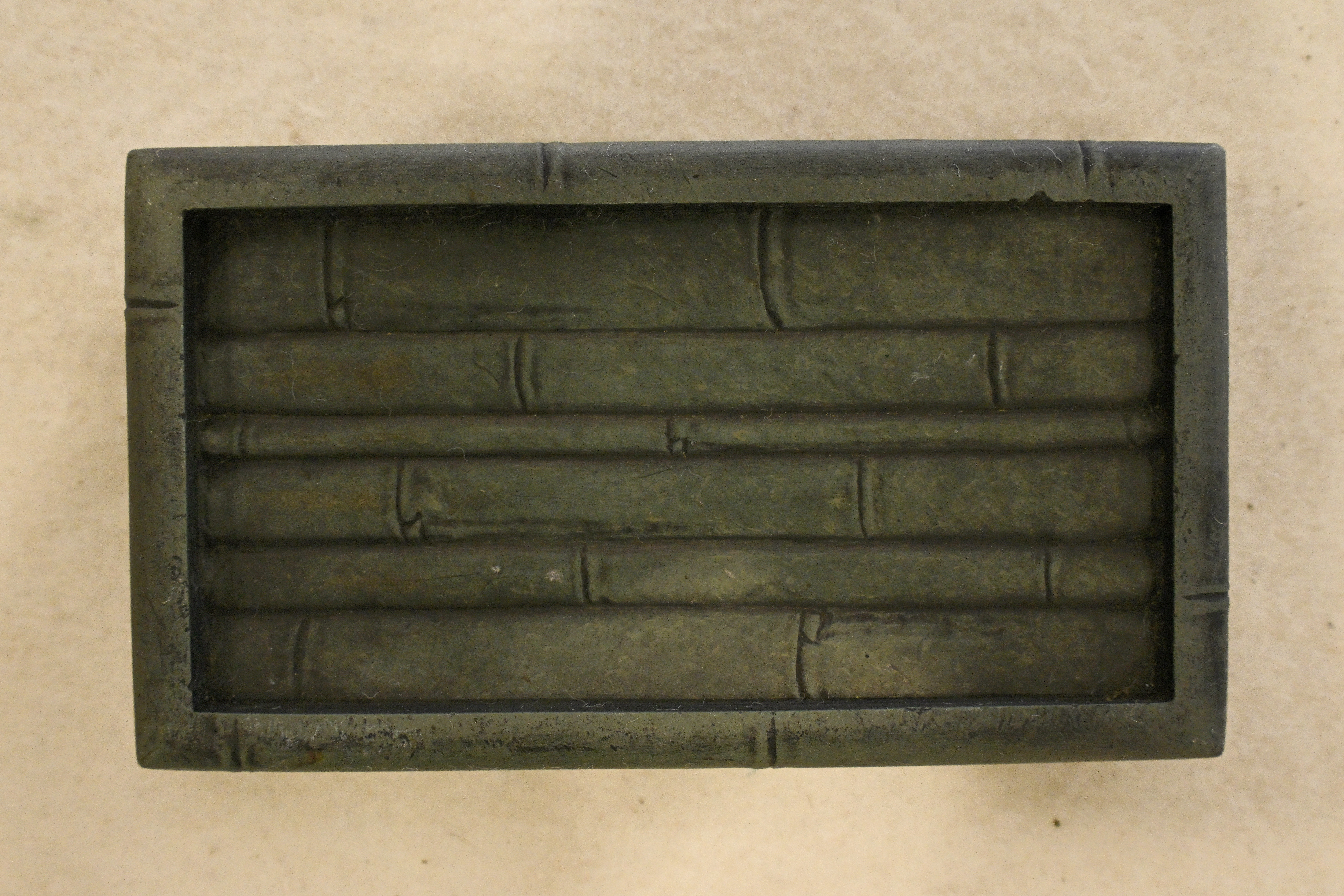 此竹节砚为石质,整体呈青灰色,沉稳而内敛。砚的形制独具匠心,砚面与砚墙精心雕刻着竹节图案,线条流畅自然,仿佛微风拂过,竹影摇曳。砚背则是竹排图案,错落有致,更添几分生动与趣味。每一处雕刻都细腻入微,将竹子的神韵展现得淋漓尽致,让人不禁感叹工匠的精湛技艺。