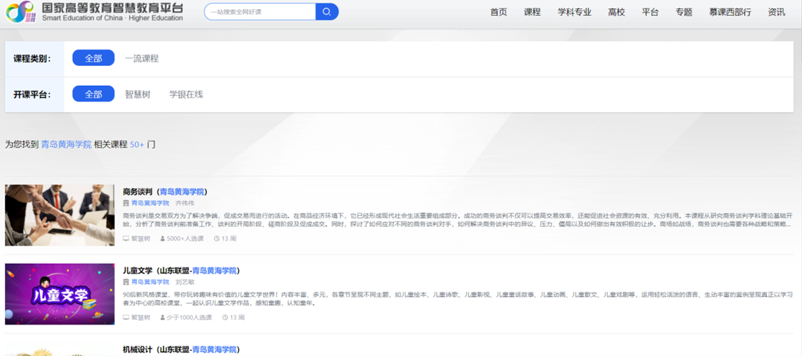 国家高等教育智慧教育平台是教育部在总结以往中国高校慕课与在线教学发展经验基础上,汇聚优质课程资源从而建设的教育平台,建设目标是汇聚国内外最好大学、最好老师建设的最好课程,成为全球课程规模最大、门类最全、用户最多的国家高等教育智慧教育平台。“智慧高教”首批上线的2万门课程是从1800所高校建设的5万门课程中精选的优质课程,课程覆盖了13个学科92个专业类。入选课程具备质量高、共享范围广、应用效果好、示范作用强特点,代表当前我国在线课程的高质量水平。