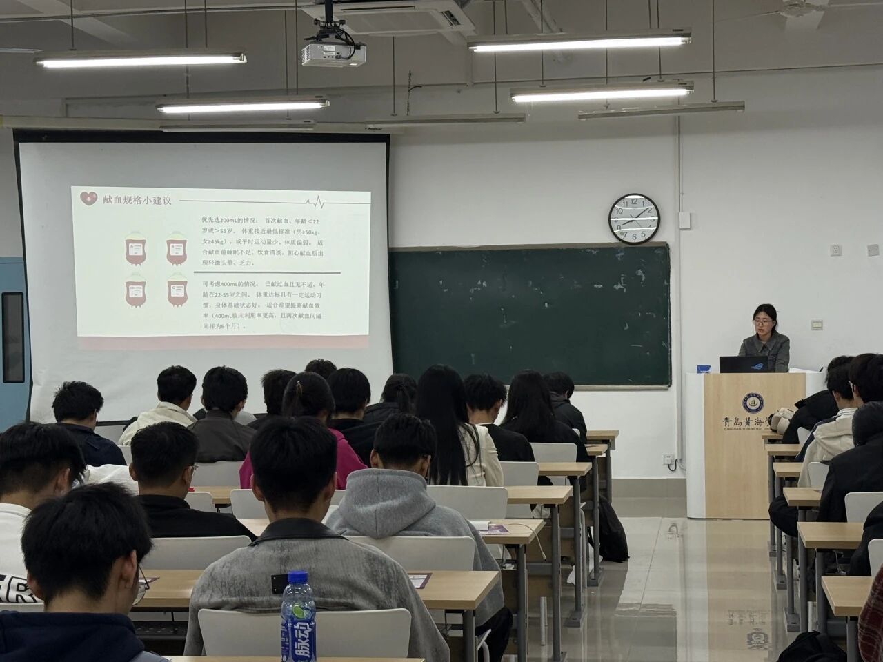 宣讲现场,宣讲团围绕着同学们最关心的问题展开细致讲解:在献血要求上,明确了18-55周岁(最高可延至60周岁)、体重达标、血压脉搏正常等基础条件,同时针对不同人群给出200ml或400ml的献血规格建议,让同学们清晰了解自身是否符合献血标准;在注意事项上,系统梳理了献血前清淡饮食、保证睡眠,献血后按压止血、避免剧烈运动等关键要点,更详细科普了献血后身体的自我调节机制,用科学数据打破“献血伤元气”的误区。针对大众普遍存在的认知误区,宣讲团逐一进行科学辟谣:“献血会伤身体?”——健康成人一次献血200-400ml仅占全身血量的5%-10%,身体会在数小时内恢复血容量,1-2周内补充完所有血液成分,反而能促进血液循环、降低心血管疾病风险;“献血会感染传染病?”——正规采血点全程使用一次性无菌耗材,严格执行无菌操作,感染风险为零。