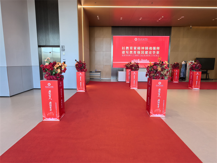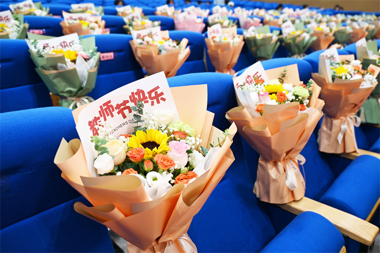 红毯映初心,鲜花寄敬意。表彰大会现场,为教职工铺设的红毯象征着他们深耕教坛的岁月足迹,座椅上的祝福鲜花传递着对“桃李芬芳”的礼赞,隆重而温馨的氛围里,满是对教育者的尊崇与感念。