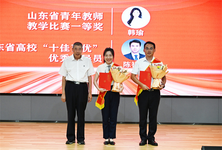 李清山为荣获"山东省青年教师教学比赛一等奖"“省高校‘十佳百优’优秀辅导员”的教师颁奖