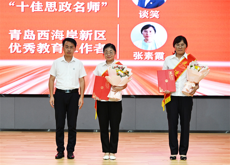 孟广东为荣获第四届在青高校“十佳思政名师"“青岛西海岸新区优秀教育工作者”的教师颁奖