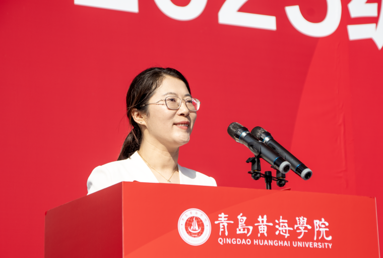 教师代表马克思主义学院沈盼盼老师发言。她代表全体教师,向2025级新同学表示热烈的欢迎。她表示,大学是自主学习的舞台,同学们需从“刷题者”转变为“解题者”,从“内卷”迈向“内驱”,从“小我”升华至“大我”。她鼓励新生在黄海学院这片沃土上,锤炼品格、追求卓越,以“国之大者”的胸怀,让青春的脚步始终与祖国的发展同行。
