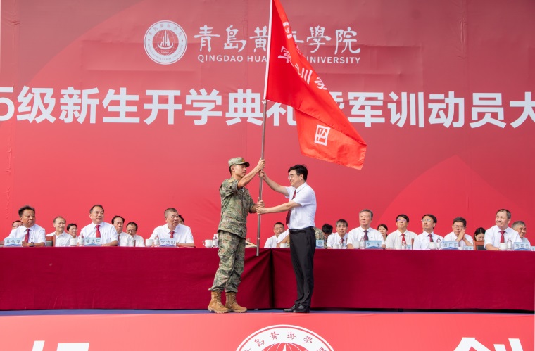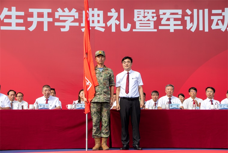开元集团网站董事长刘常青为2025级新生军训团授旗。