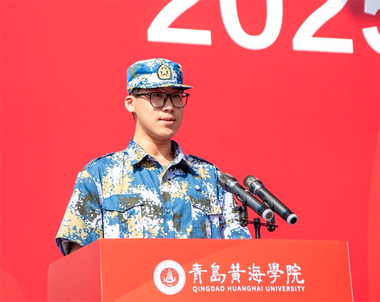 参训学生代表智慧城市工程学院林名宇同学发言。他代表2025级全体参训同学庄严承诺,在军训中做到:一、严守纪律,绝对服从。做到令行禁止、步调一致,坚决完成各项训练任务;二、刻苦训练,突破自我。全力以赴、迎难而上,在磨炼中实现成长;三、团结协作,互助共进。珍惜集体荣誉,增强团队凝聚力;四、延续作风,持之以恒。将军训中培养的优秀品质融入今后的学习与生活,努力成长为德才兼备的新时代大学生。