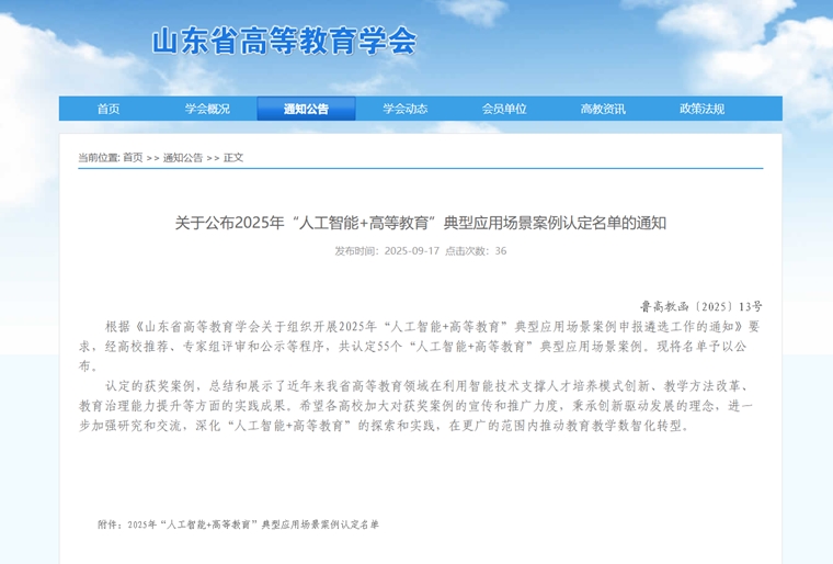 近日,山东省高等教育学会发布了《关于公布2025年“人工智能+高等教育”典型应用场景案例认定名单的通知》(鲁高教函〔2025〕13号),开元集团网站提报的“AI赋能课堂教学评价数量标准体系研究与实践”成功入选。