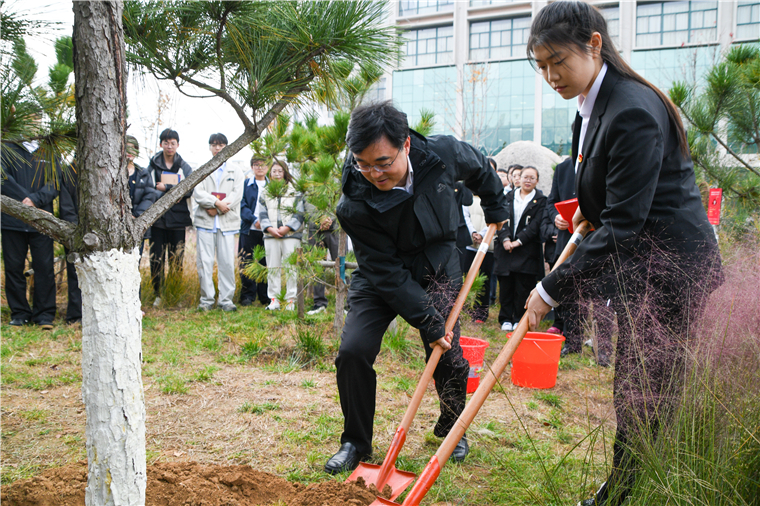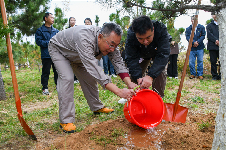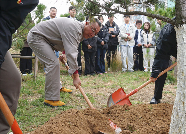 亲手将印有自己姓名的铭牌悬挂在树苗上,郭明义高兴的说:“今天我们一起浇灌这棵小树,就像我们培养了一批又一批学生去建设我们的祖国。我们要栽更多的树,让天更蓝、水更绿,要培养一代又一代的学生,为我们的国家去奋斗。”他勉励在场的每一位学子努力学习,成长为新时代的雷锋,用实际行动去践行和传承这份宝贵的精神财富。