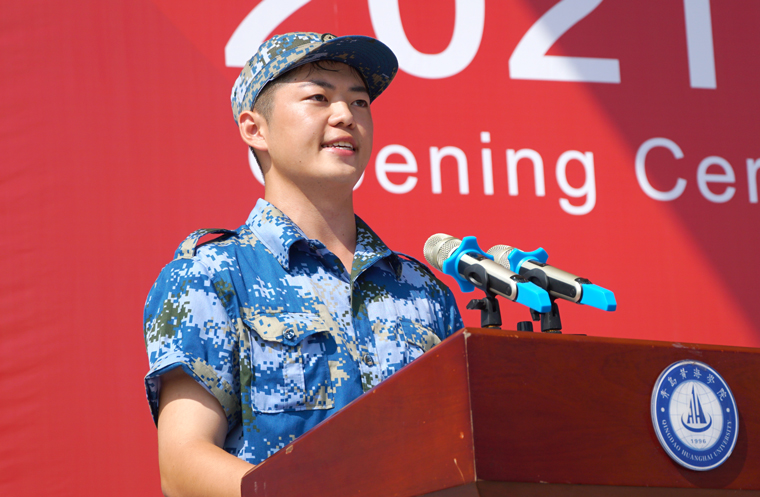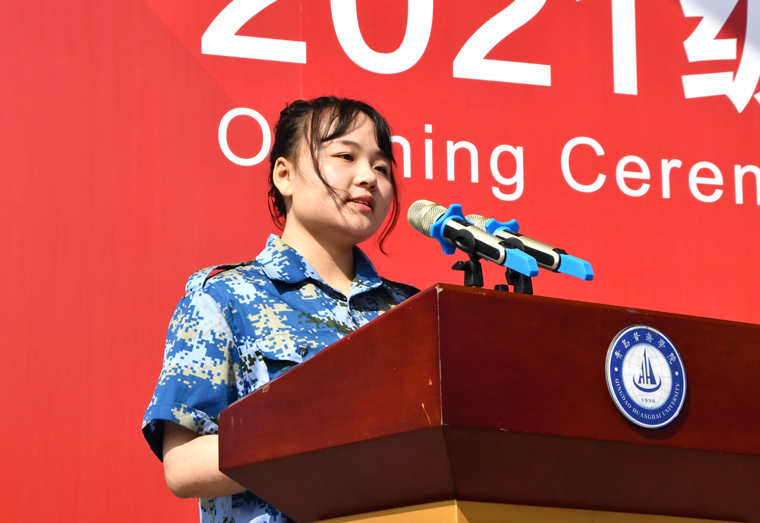 参训学生代表,艺术学院2021级新生孙骏哲代表全体军训学员郑重承诺:以军人的身份严格要求自己,发扬军训优良作风,严格遵守军训纪律,发扬吃苦耐劳的精神,以振奋的精神状态,接受军训的锤炼!