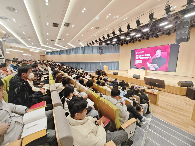 李永清教授从党的二十大提出把马克思主义与中华优秀传统文化相结合入题,引用习近平总书记关于弘扬中华优秀传统文化的系列论述,重点阐述了习近平文化思想的提出及主要内容。他结合个人研究经历与学者对中华优秀传统文化的概括,向大家阐释了为什么必须把马克思主义与中华优秀传统文化相结合。他认为既要弘扬中华优秀传统文化,也要吸收世界其他优秀文化成果,要着力加强国际传播能力建设、促进文明交流互鉴。他勉励同学们,立足伟大实践,夯实文化自信,洞察时代大势,把握历史主动,以昂扬向上的姿态,赓续中华文脉,努力成长为祖国的栋梁之才。